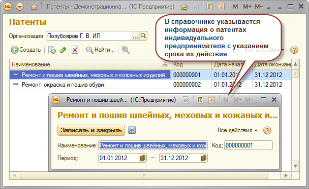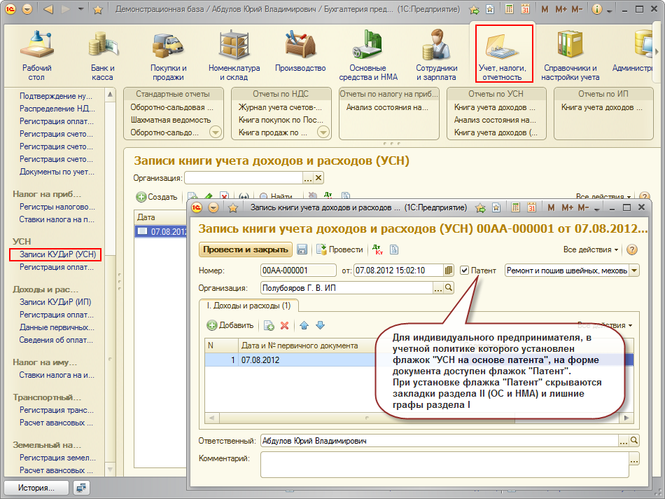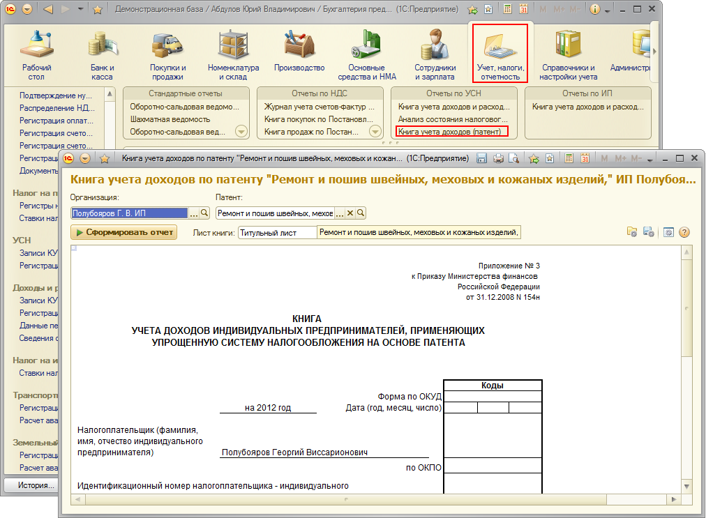 Отчет «Книга учета доходов по УСН на патенте»