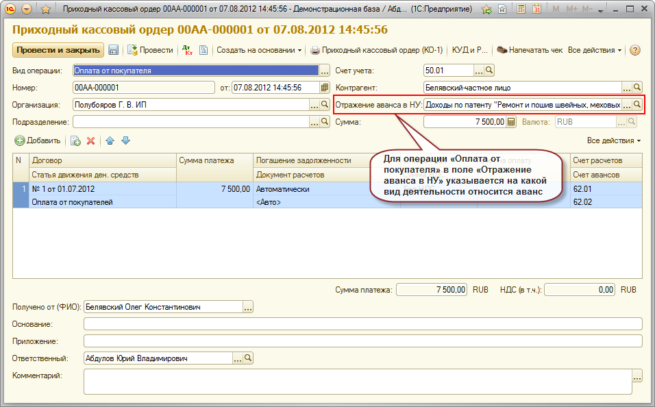Документ "Приходный кассовый ордер"