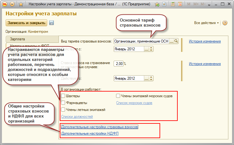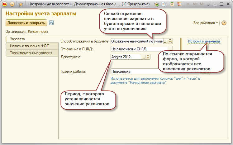 При ведении учета расчетов по заработной плате в 1С:Бухгалтерии 8 форма включает все настройки, влияющие на расчет зарплаты, сгруппированные на трех закладках.