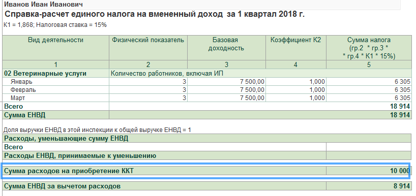 Расчет и начисление налога выполняются автоматически с учетом вычета на приобретение онлайн-касс.