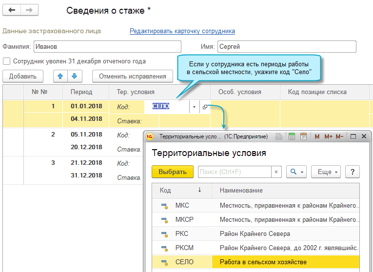 При выгрузке Сведений о стаже код "ДЛОТПУСК" будет указан, только если у сотрудника есть особые условия труда или основание досрочной пенсии (за исключением кодов 27_ГД, 27-ГДХР, 27-ПД, 27-ПДРК, 27-СМ, 27-СМХР).