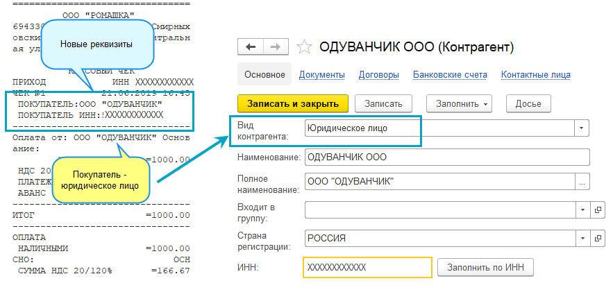 Добавлены новые обязательные реквизиты в чеки ККТ - наименование и ИНН покупателя. Эти реквизиты заполнятся в чеке ККТ, начиная с 01.07.19, при расчетах наличными с юридическими лицами и индивидуальными предпринимателями. А также оплате по платежной карте.