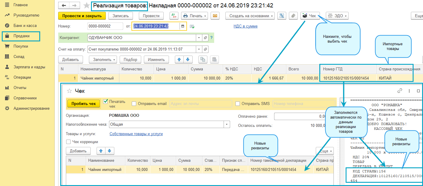 Добавлены новые обязательные реквизиты в чеки ККТ - страна происхождения и ГТД. Эти реквизиты заполнятся в чеке ККТ, начиная с 01.07.19, при расчетах за импортные товары.