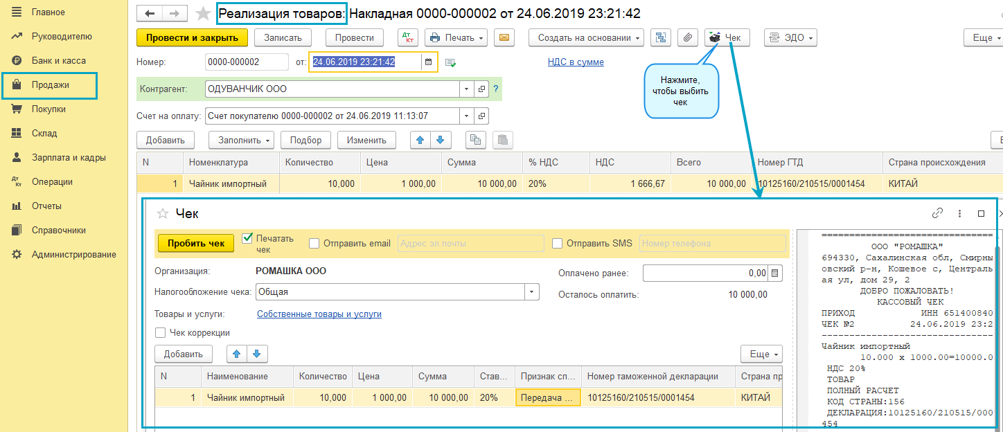 Добавлена возможность пробивать чеки при оформлении отгрузки из документа "Реализация (акты, накладные)". В соответствии с требованиями Федерального закона от 22.05.2003 № 54-ФЗ "О применении контрольно-кассовой техники при осуществлении расчетов в Российской Федерации" такие чеки нужно пробивать с 01.07.2019.