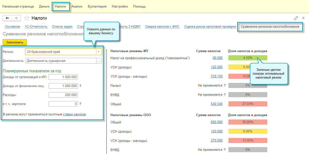 Выбрать оптимальный режим налогообложения для вашего бизнеса поможет инструмент Сравнение режимов налогообложения