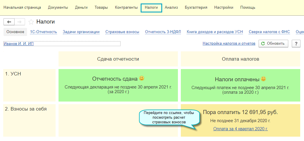 Простой интерфейс: меню "Налоги - Основное или Страховые взносы".