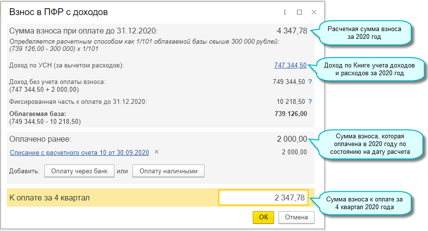 В текущем квартале Помощник оплаты взносов определяет сумму взноса в ПФР с доходов расчетным способом. При расчете предполагается, что все взносы будут оплачены до конца квартала и учтены в расходах УСН.