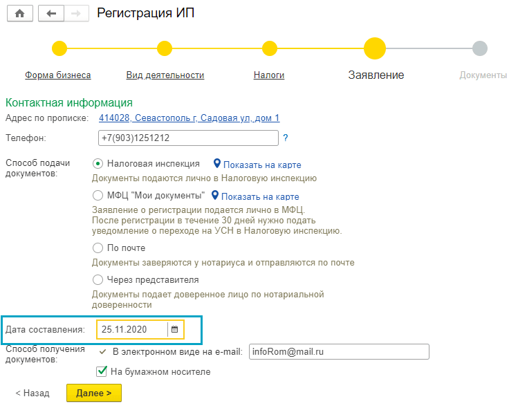 Добавлена возможность заполнения новых заявлений о государственной регистрации юридических лиц и ИП в сервисе регистрации. Новые формы Р11001 и Р21001 действуют с 25.11.2020 (Приказ ФНС России от 31.08.2020 №ЕД-7-14/617@).