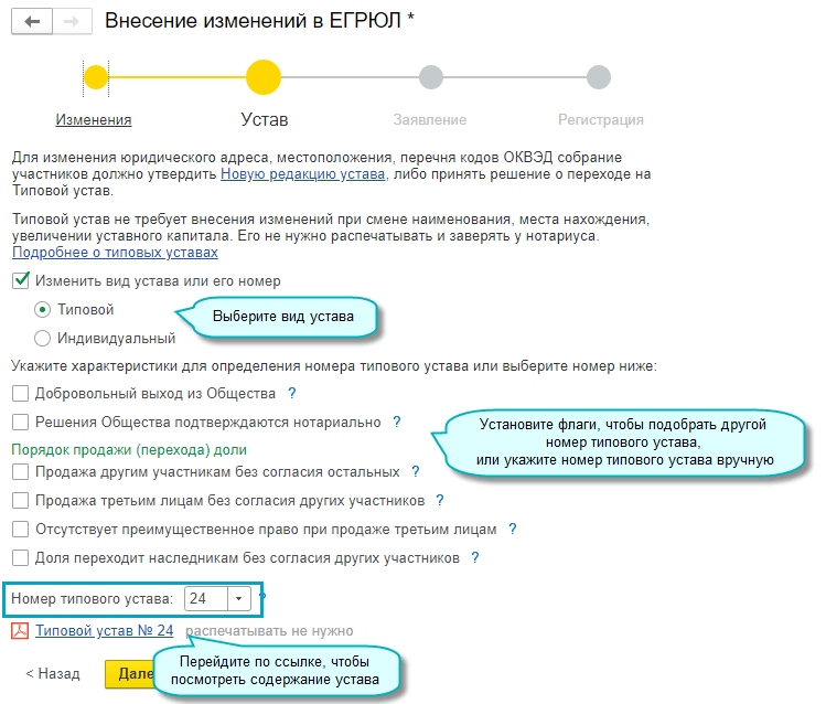 Простой интерфейс: меню "Настройки - Основное - Внесение изменений в ЕГРЮЛ".