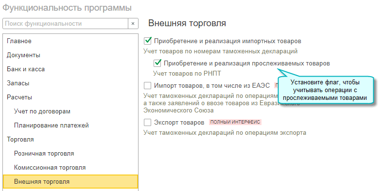 Полный интерфейс: меню "Главное - Настройки - Функциональность - Внешняя торговля".