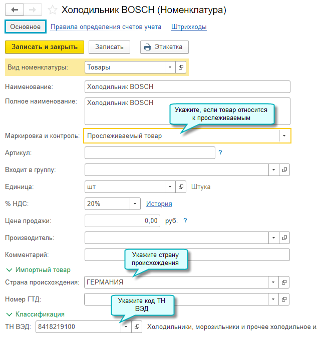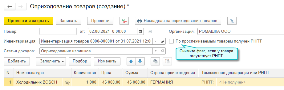 Для начала учета прослеживаемых товаров достаточно получить РНПТ остатков и сделать следующие настройки.