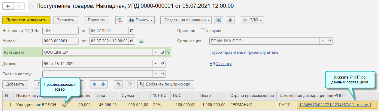 Добавлена возможность указания РНПТ для прослеживаемых товаров во всех документах поступления.