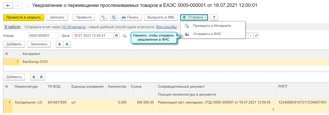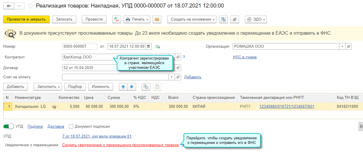 Предусмотрено напоминание о необходимости сообщения в ФНС в течение 5 рабочих дней о реализации прослеживаемых товаров контрагентам из стран, являющихся участниками ЕАЭС.