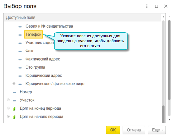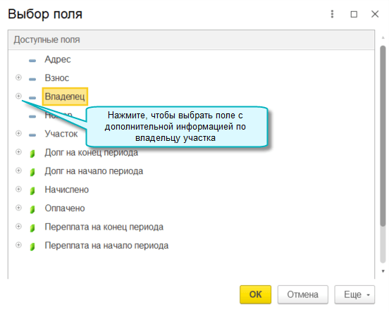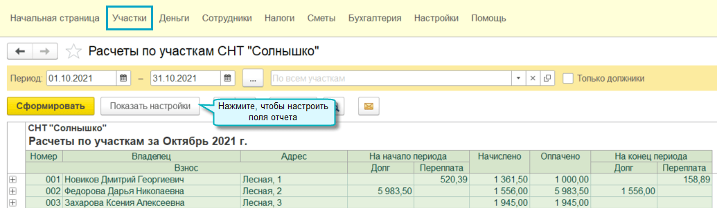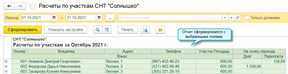 Добавлена возможность включать дополнительные колонки в отчеты Расчеты по участками и Расчеты по взносам, например, сведения о номере телефона владельца участка, площадь участка и другие. Также можно настроить и сохранить свой вариант отчета, вернуться к стандартным настройкам отчета.