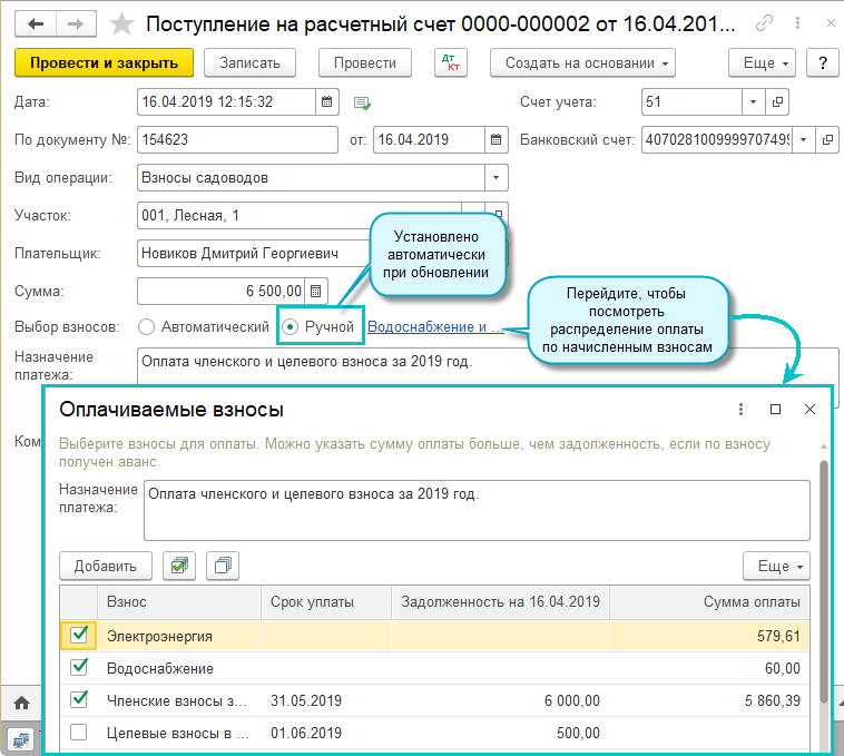 Распределение сумм оплаты по начисленным взносам по-прежнему может быть проведено вручную или автоматически. Однако алгоритм автоматического распределения изменился. Теперь оплата зачитывается по тем взносам, которые были начислены на момент поступления оплаты.