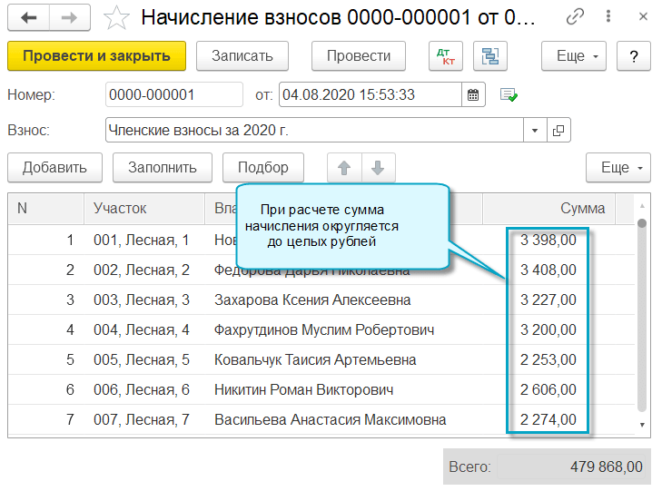 Добавлена возможность округления взносов до целых рублей. Это нужно, если для упрощения расчетов общее собрание приняло решение начислять взносы в целых рублей.