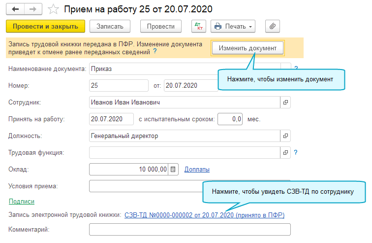 Добавлена возможность регистрировать и отправлять в ПФР форму СЗВ-ТД при вводе документов Прием на работу, Кадровый перевод и Увольнение.