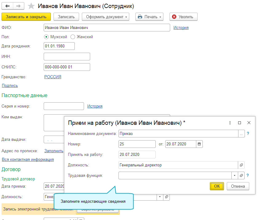 Полый интерфейс: меню "Зарплата и кадры - Сотрудники", карточка сотрудника