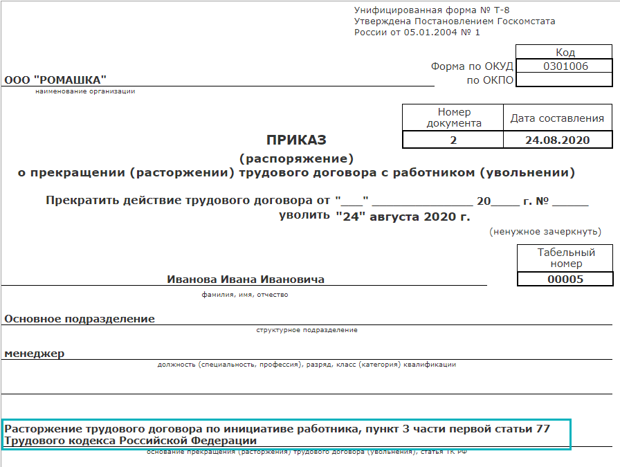 Добавлена возможность редактирования стандартного наименования основания увольнения в приказах на увольнение (форма Т-8) и личных карточках (форма Т-2).