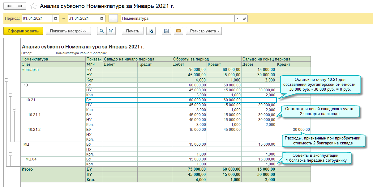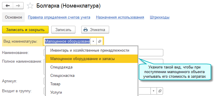 Для учета таких объектов добавлен вид номенклатуры "Малоценное оборудование и запасы" и счет 10.21 "Малоценное оборудование и запасы" с субсчетами: