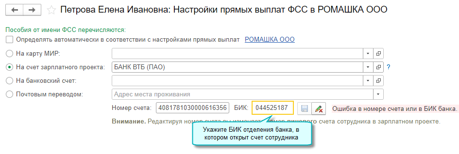 Добавлена возможность изменения БИК банка в настройках прямых выплат ФСС по сотруднику. Это необходимо в ситуации, когда различаются отделение банка, в котором обслуживается зарплатный проект организации, и отделение банка, в котором открыт счет сотрудника.