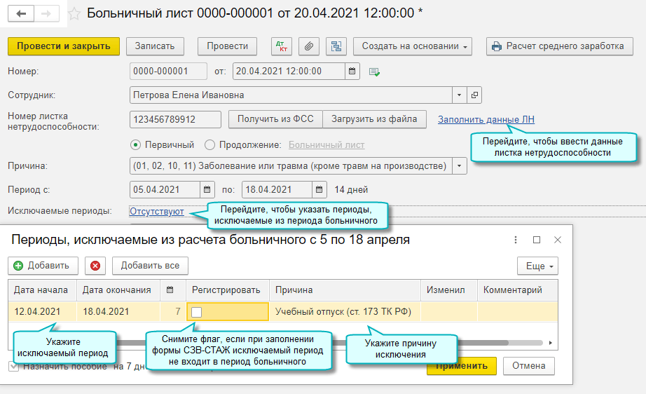 Добавлена возможность указать в больничном листе периоды, за которые не выплачивается пособие, согласно формату ФСС 1.7.7.