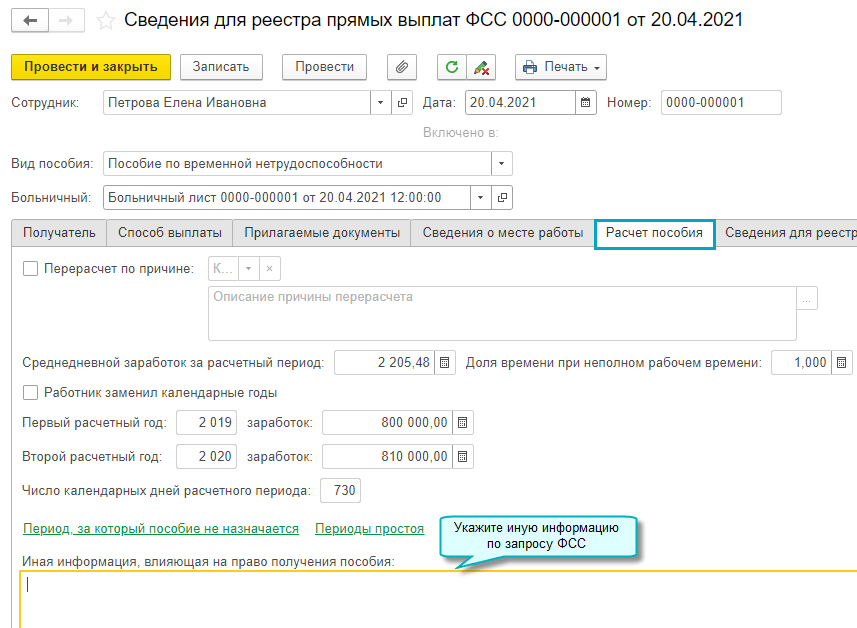 Добавлена возможность передачи в ФСС дополнительной информации, влияющей на получение пособия, согласно формату ФСС 1.7.7.
