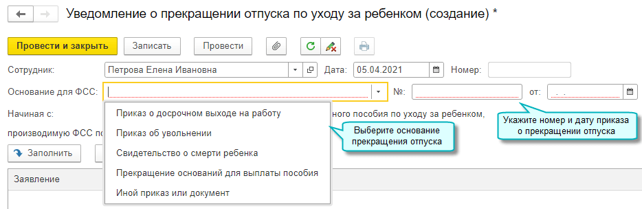 Расширен перечень оснований прекращения отпуска по уходу за ребенком согласно формату ФСС 1.7.7. Добавлена возможность указать реквизиты приказа о прекращении отпуска.