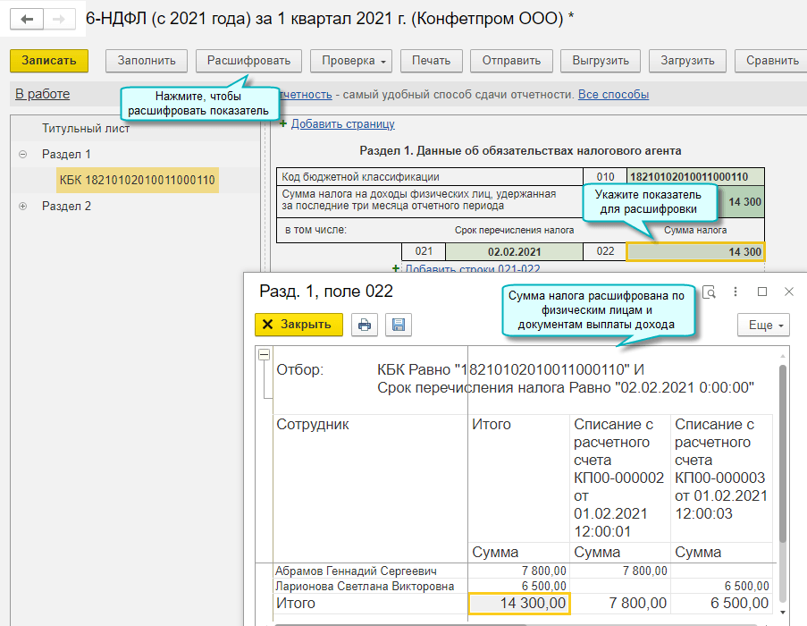 Добавлена возможность расшифровать в Разделе 1 формы 6-НДФЛ удержанный НДФЛ по физическим лицам и документам выплаты им дохода.