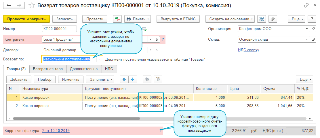 Добавлена возможность заполнять Возврат поставщику на основании нескольких документов поступления. А также возможность формирования единого корректировочного входящего счета-фактуры.