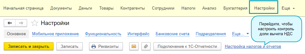 Полный интерфейс: меню "Главное - Организации - Система налогообложения".