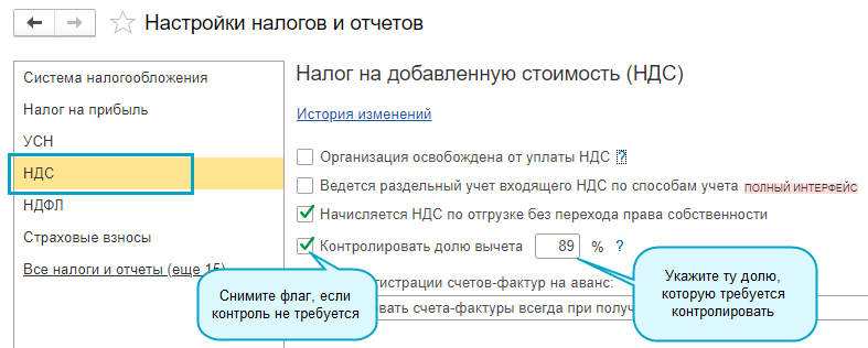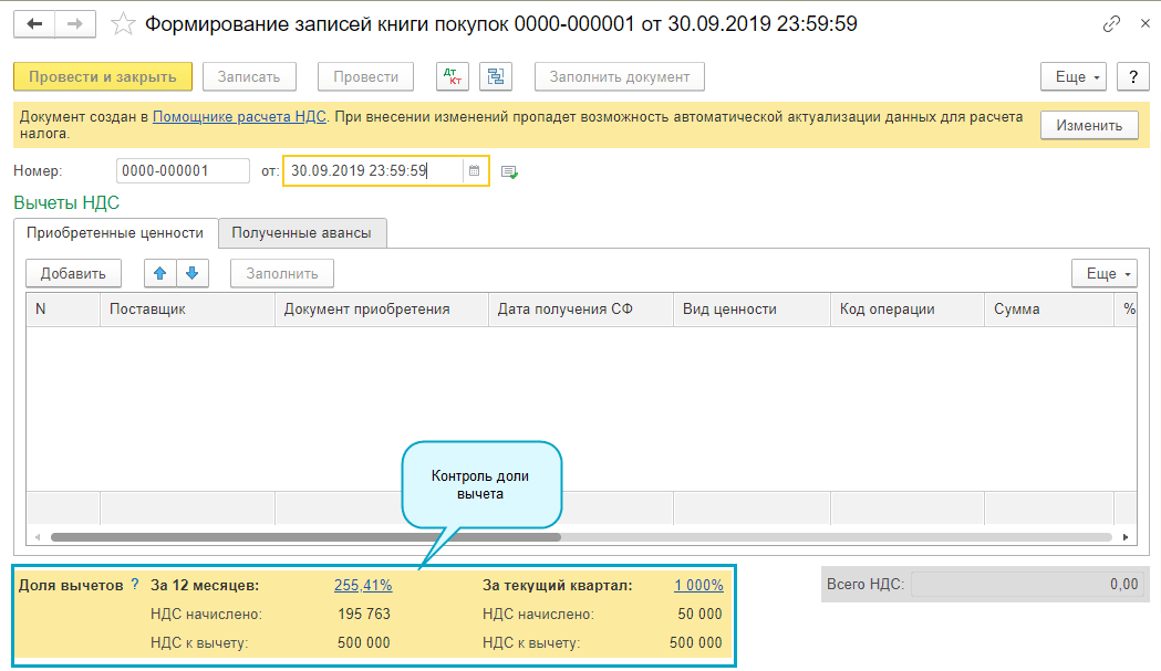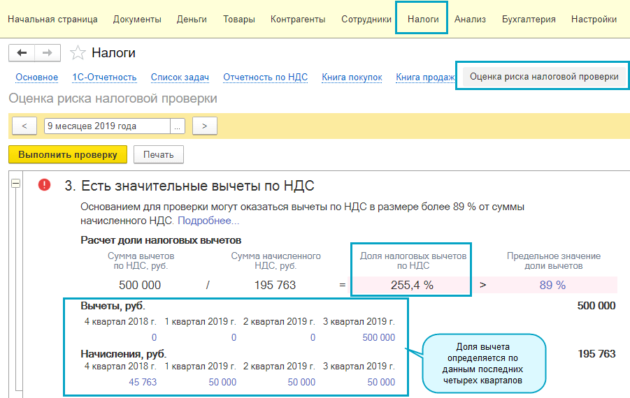 Добавлен контроль отражения в налоговой отчетности НДС значительных сумм налоговых вычетов. При формировании отчетности по НДС проверяются следующие показатели: