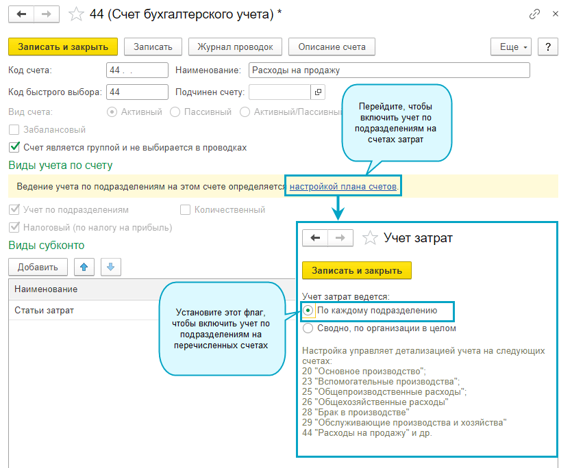 Добавлен учет по подразделениям на счете 44 "Расходы на продажу".