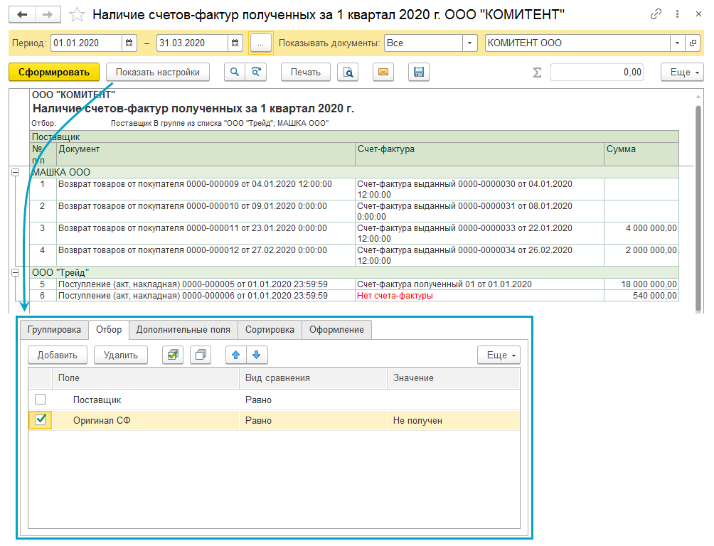 В Отчет по наличию счетов-фактур добавлена группировка по контрагентам и сумма документа, а также настройка для вывода в отчете документов по которым получен/не получен оригинал счета-фактуры.