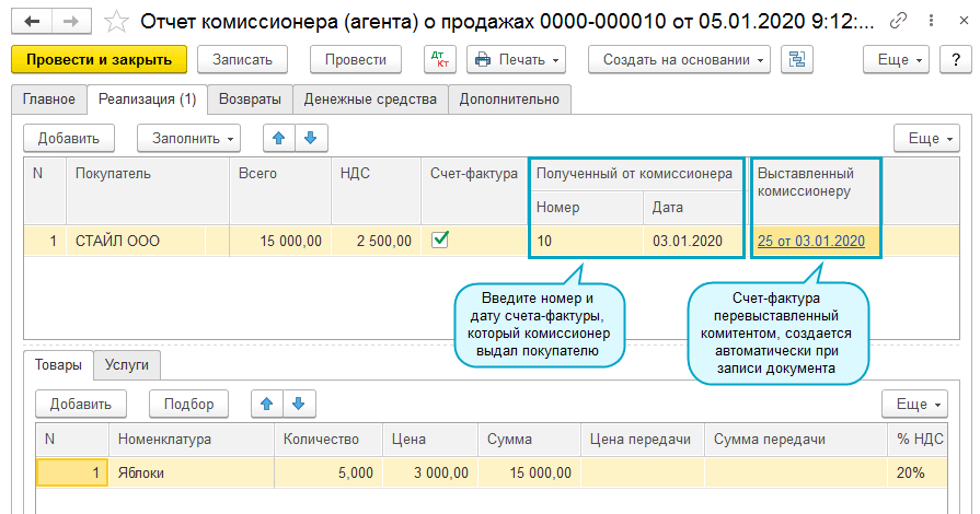 В Отчет комиссионера (агента) добавлены поля для регистрации номера и даты счетов-фактур выданных покупателям комиссионером.