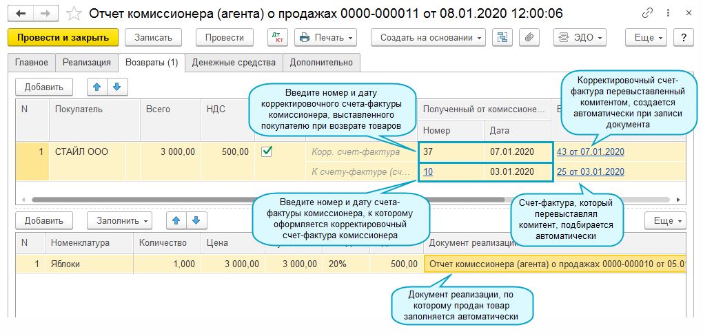 При возврате товаров заполняются номер и дата корректировочного счета-фактуры выданного покупателю комиссионером, по которому комитенту необходимо перевыставить корректировочный счет-фактуру.