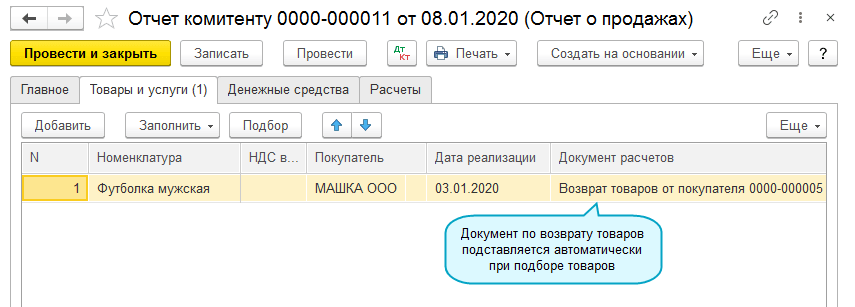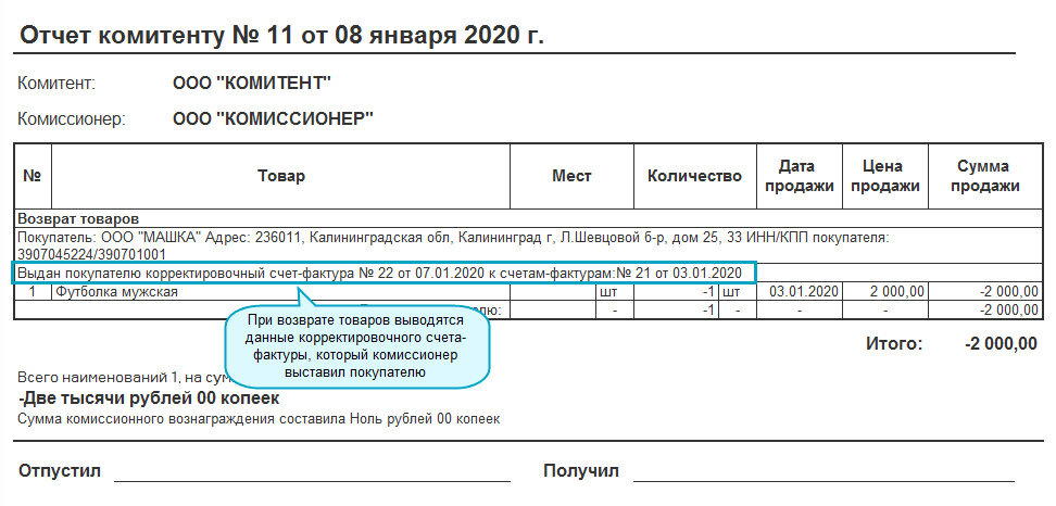 В случае возврата товаров в Отчете комитенту выводятся данные о выданном покупателю корректировочном счете-фактуре.