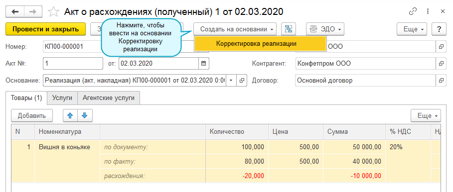 На основании Акта о расхождениях (полученный) нужно создать Корректировку реализации и, при необходимости, корректировочный счет-фактуру. Корректировочные документы можно отправить покупателю по ЭДО.