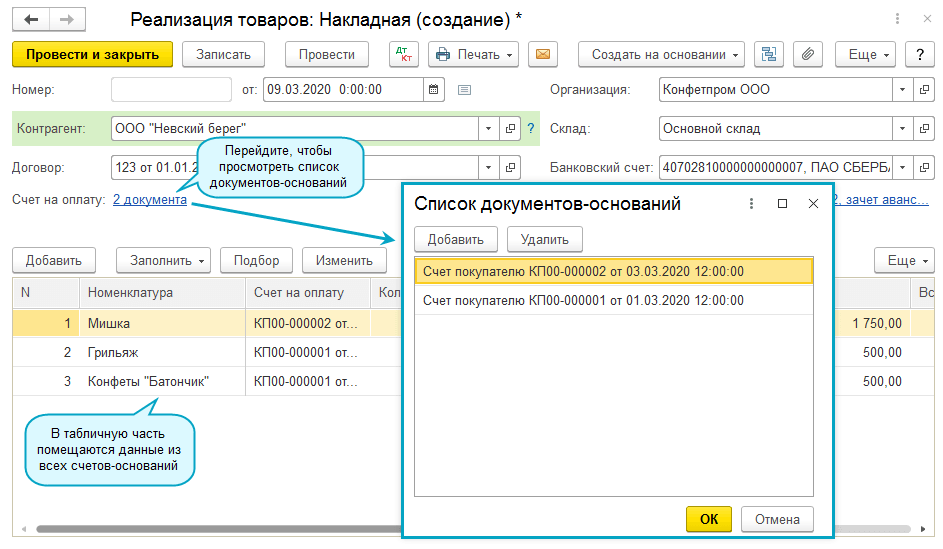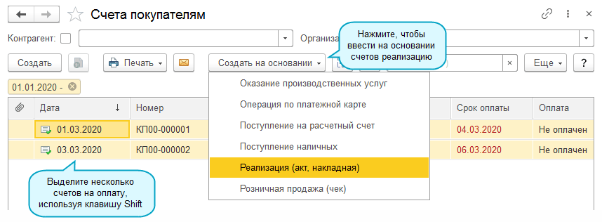 Добавлена возможность на основании нескольких счетов на оплату создать документ реализации.