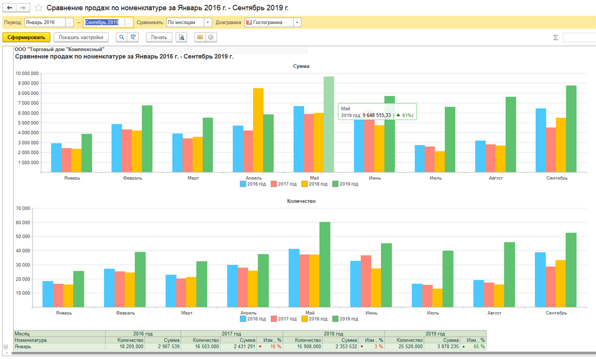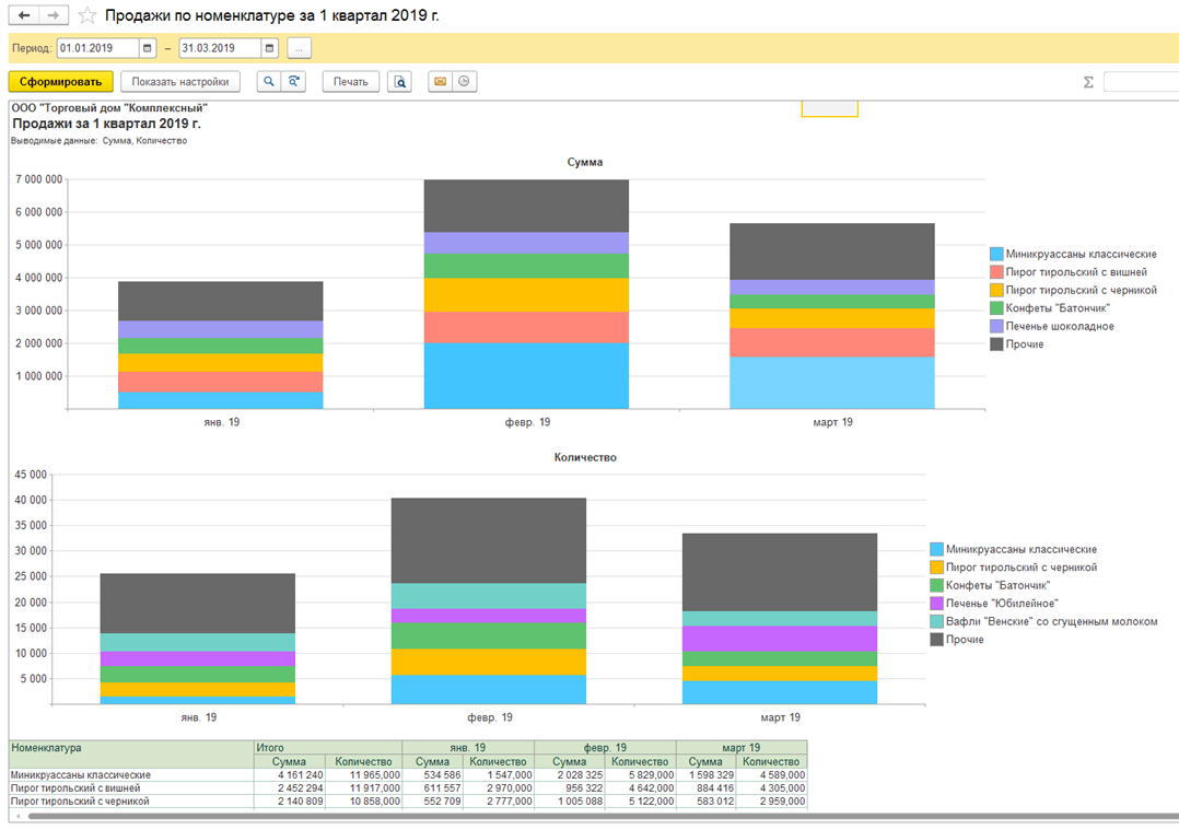 Теперь в отчете "Продажи" выводятся сразу обе диаграммы - "Сумма" и "Количество", если отмечены соответствующие флажки в панели настроек.