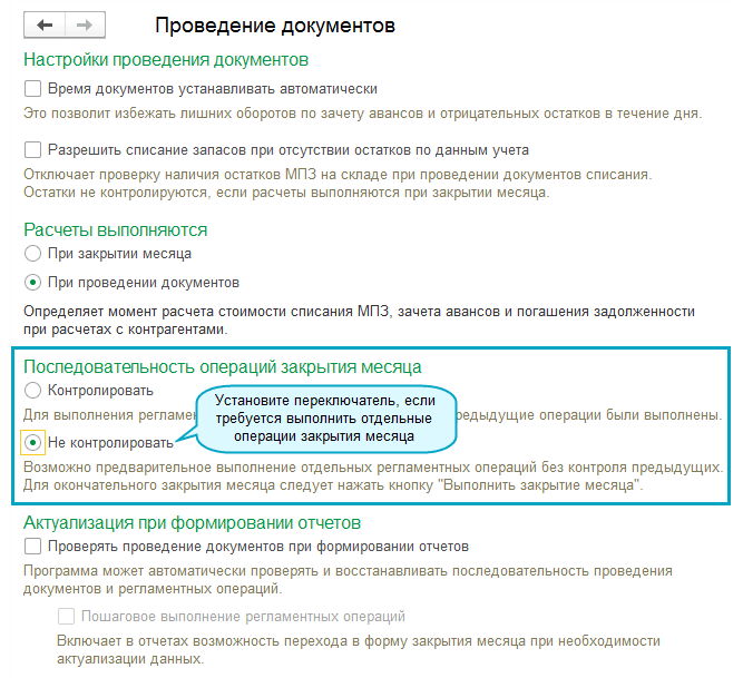 Добавлена возможность выполнять закрытие отдельных регламентных операций, которые используются при закрытии месяца. При этом до окончательного закрытия месяца не требуется перепроводить все документы для восстановления последовательности проведения.