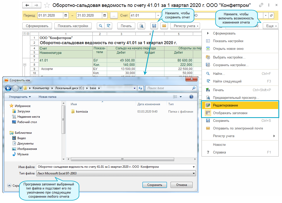 Для быстрого доступа добавлена команда "Редактирование" в подменю "Еще"; кнопка "Сохранить как" добавлена на панель отчетов.