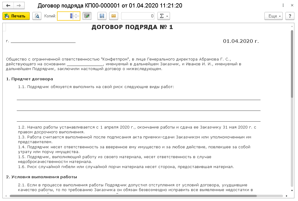 Выполните настройку функциональности программы, чтобы вести учет договоров подряда.