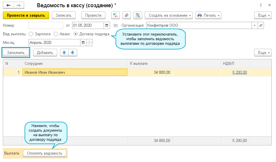 Для выплаты по договору подряда создайте ведомость в кассу или в банк.