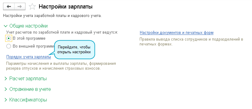Полный интерфейс: меню "Зарплата и кадры - Настройки зарплаты".