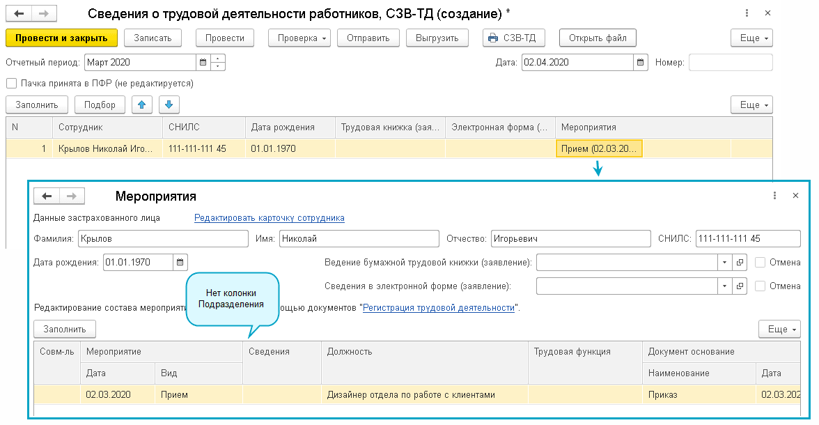 Добавлена возможность не заполнять подразделение в мероприятиях трудовой деятельности для СЗВ-ТД для организаций, в которых нет выделенных подразделений.