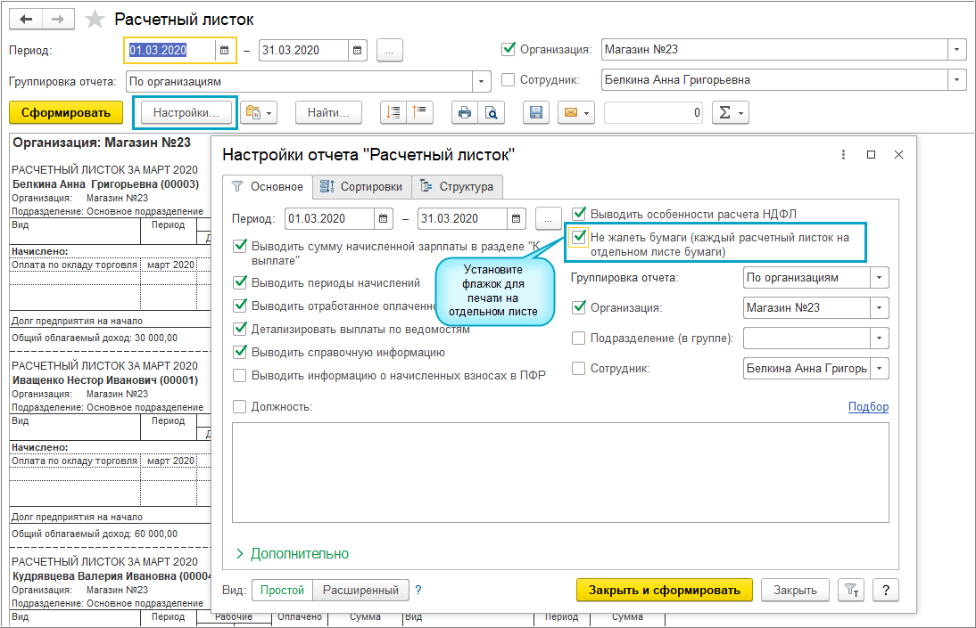 Добавлена возможность распечатать каждый расчетный листок на отдельном листе бумаги.
