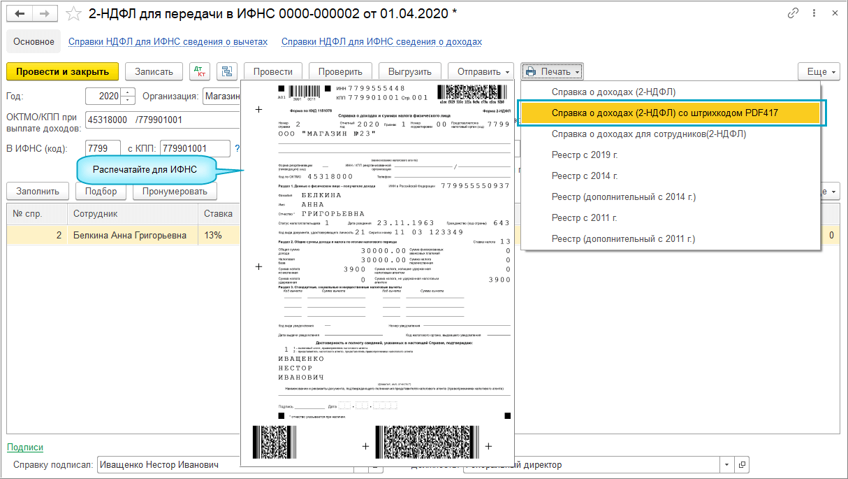 Справки о доходах 2-НДФЛ для ИФНС можно распечатать с двухмерным штрих-кодом PDF417.