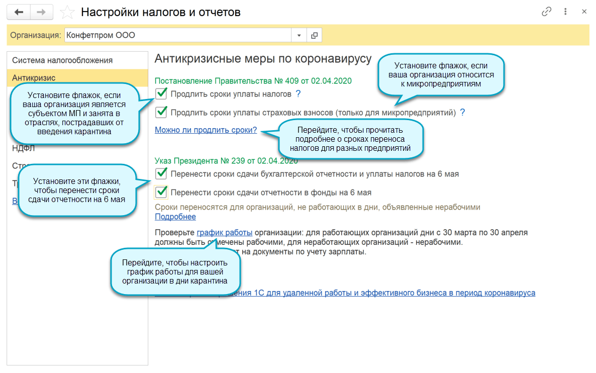Добавлена возможность настроить перенос сроков уплаты налогов и сдачи отчетности в связи с карантином.