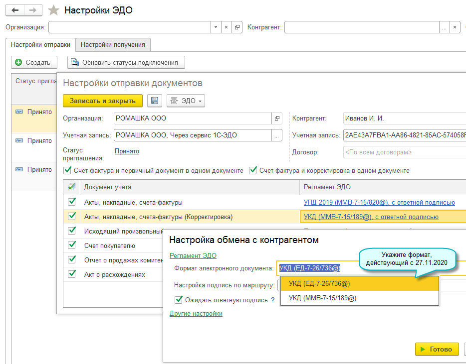 Добавлена возможность использования формата электронного УКД, утвержденного Приказом ФНС России от 12.10.2020 № ЕД-7-26/736@. Этот формат действует с 27.11.2020.